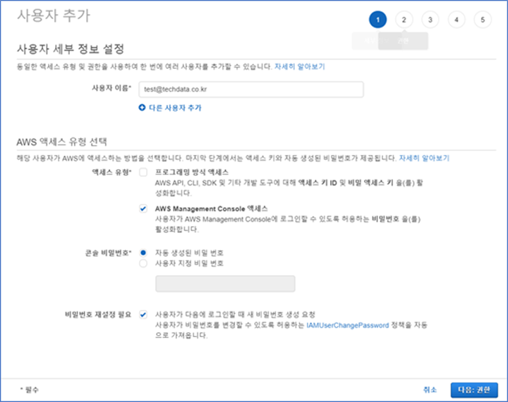 - AWS Management Console 액세스 : 사용자가 AWS Management Console에 접근할때 체크한다.