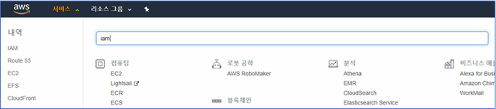 #.1 AWS 관리콘솔에 로그인 하여 상단의 서비스에서 IAM 서비스를 찾는다.