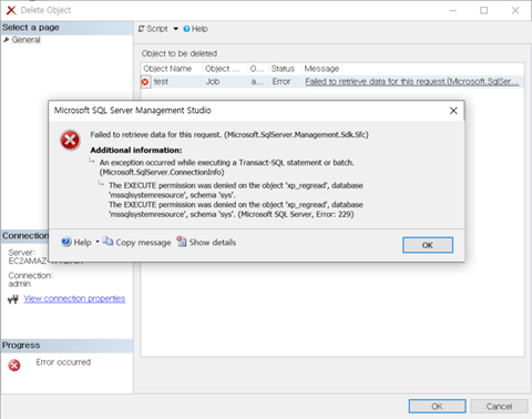 수동장애조치를 SSMS 에서 하려면 인증관련 이슈가 있다.