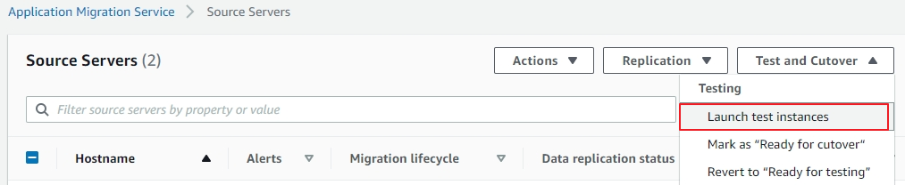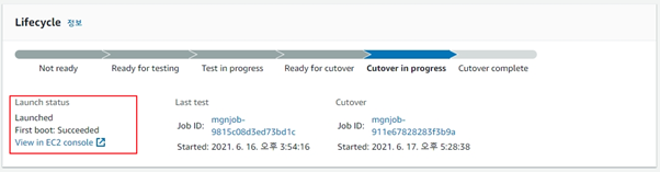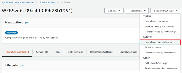 상태가 변경이 된 후 Product 환경에 실 서버로 생성하면 해당 서버에 대해서 마이그레이션이 모두 종료가 됩니다. “Launch cutover instatnces”를 클릭합니다.