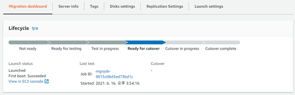 정상적으로 복제가 된 것을 확인 후 “Mark as “Ready for cutover”를 클릭하여 준비 상태로 변경합니다.
