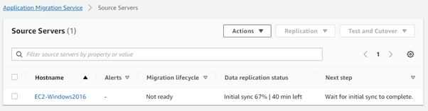 콘솔에서 Source Servers 메뉴를 보면 해당 서버가 보이고 자동으로 복제를 시작합니다.
