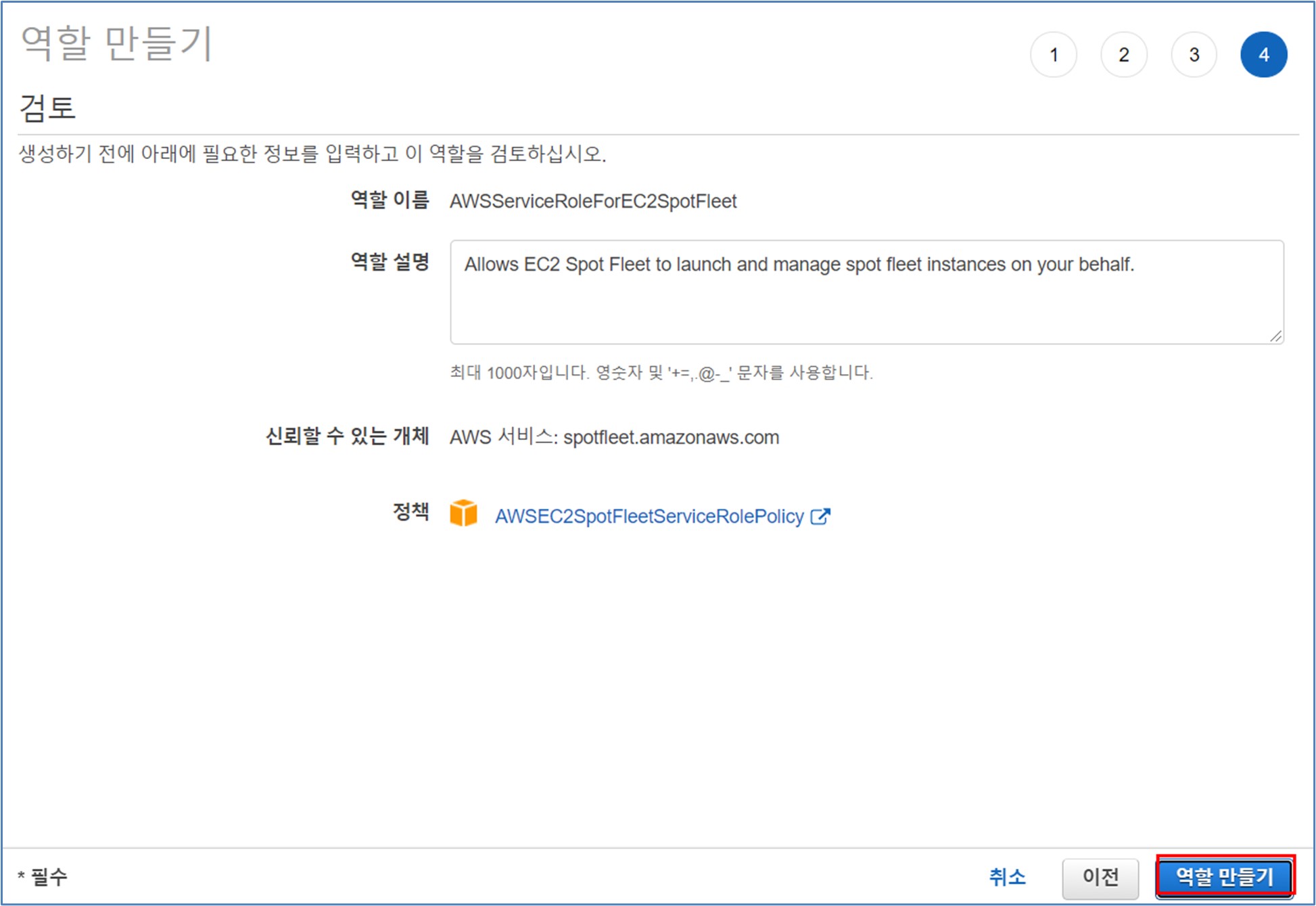 - 역할 서비스에서 ‘EC2’를 선택하고, 세부선택에서 ‘EC2-Spot Fleet’를 선택합니다.