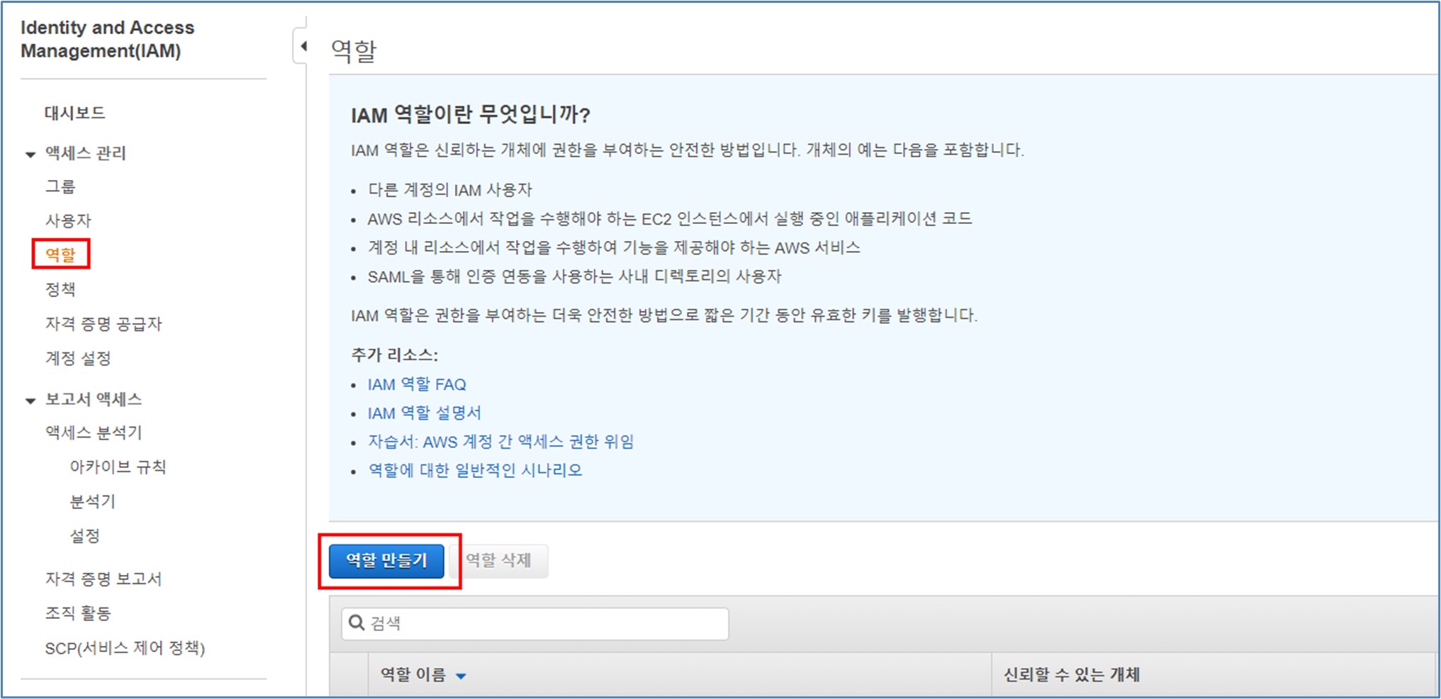 - IAM 서비스에서 역할을 선택하고 ‘역할 만들기’를 클릭합니다.