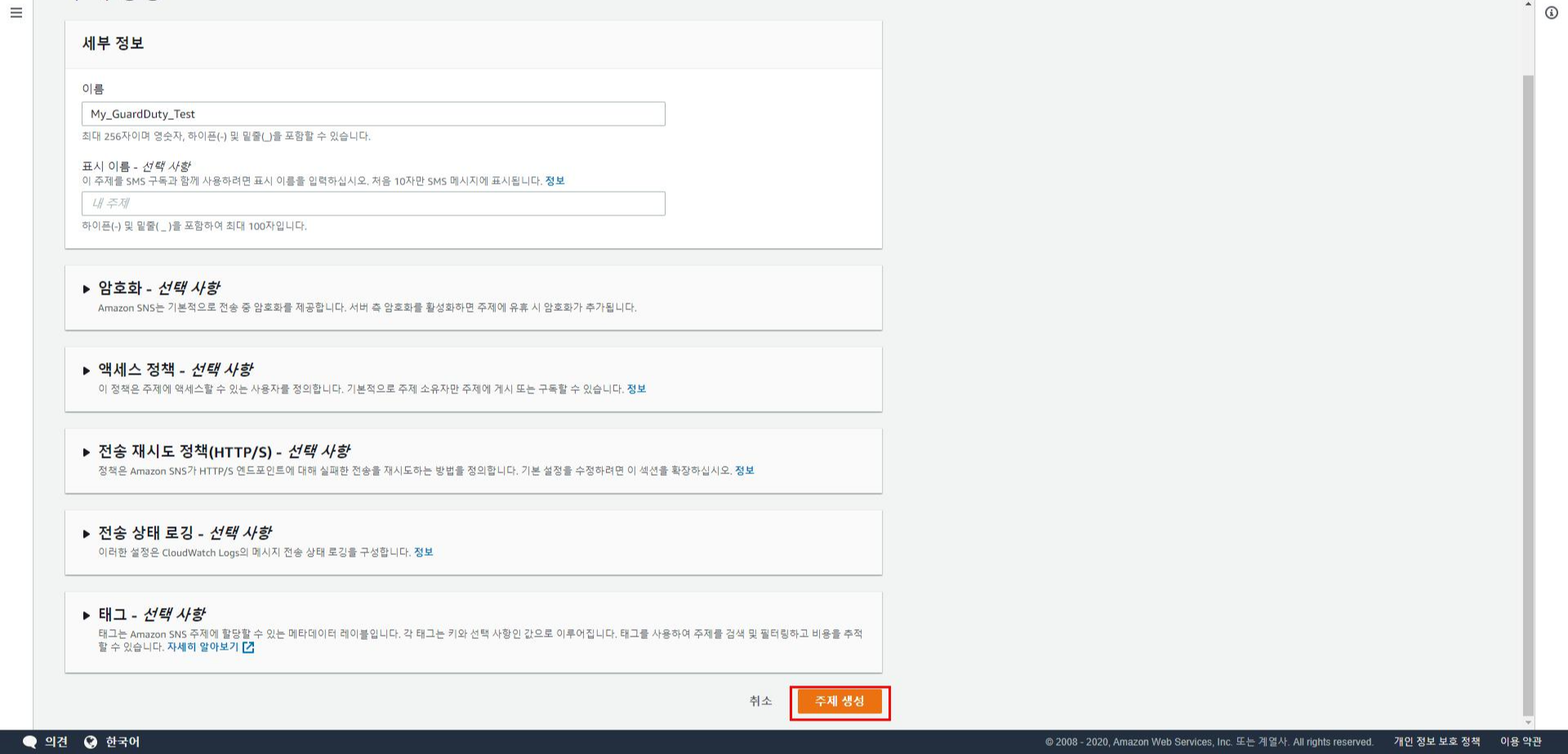 GuardDuty는 AWS 리소스(ex.EC2)에 대한 위험탐지 서비스입니다. 활성화 하는 것만으로도 간단하게 서비스의 기능을 이용할 수 있지만, 기본적으로 메일이나 문자같은 알람 서비스는 제공하지 않습니다. 이번에는 AWS의 GuardDuty와 CloudWatch 서비스를 활용한 SNS 경보 메시지 받을 수 있는 환경을 구성하고자 합니다.