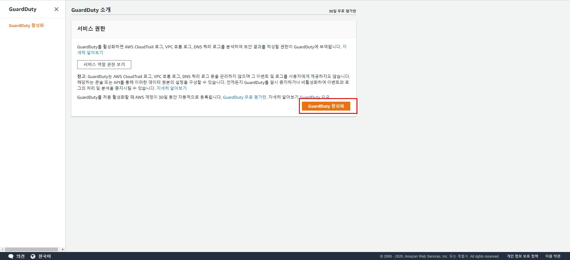 - AWS GuardDuty를 활성화합니다. (30일은 무료 평가판 제공)
