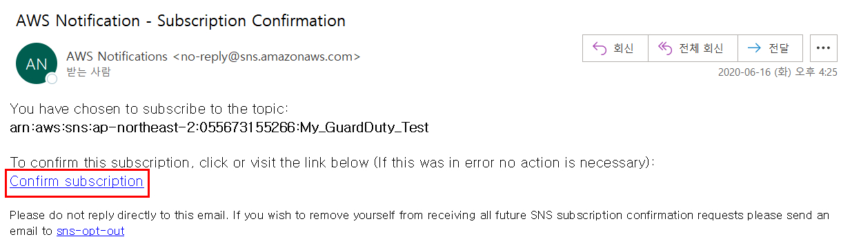 - 구독을 생성하면, 구독한 주체를 대상으로 확인 메일이 전송됩니다. 수신한 메일에 대해서 'Confirm subscription'을 클릭하면 비로소 구독이 완료됩니다.