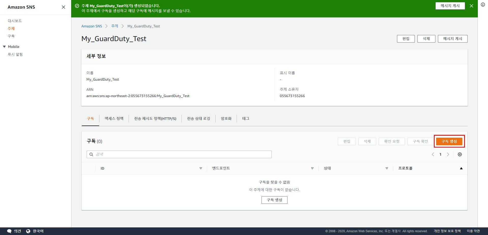 <해당 주제의 페이지에서 '구독 생성' 클릭>
