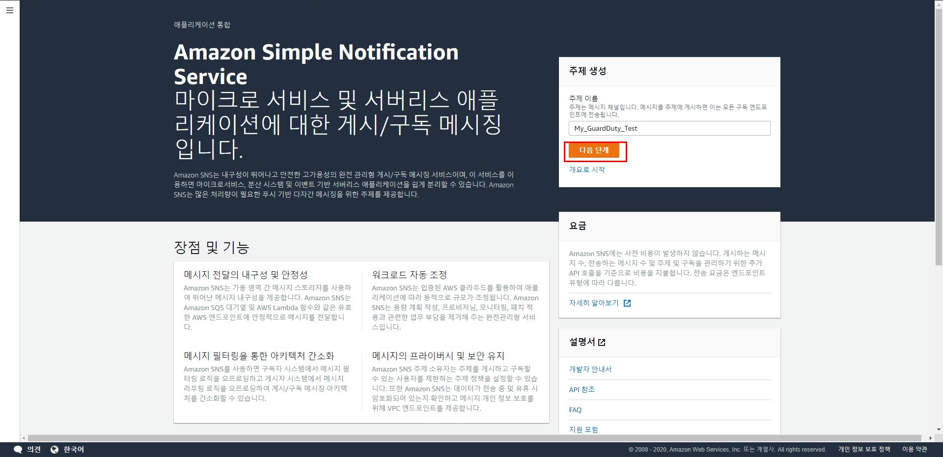 GuardDuty는 AWS 리소스(ex.EC2)에 대한 위험탐지 서비스입니다. 활성화 하는 것만으로도 간단하게 서비스의 기능을 이용할 수 있지만, 기본적으로 메일이나 문자같은 알람 서비스는 제공하지 않습니다. 이번에는 AWS의 GuardDuty와 CloudWatch 서비스를 활용한 SNS 경보 메시지 받을 수 있는 환경을 구성하고자 합니다.