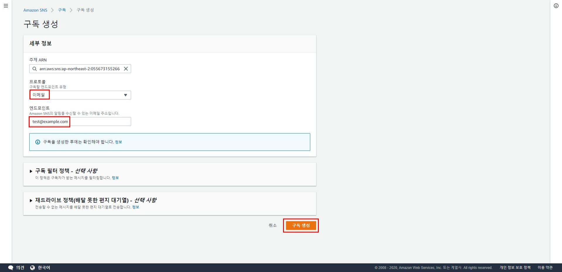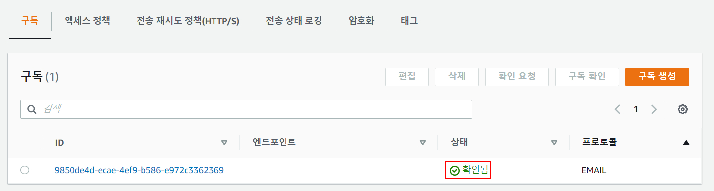 - 해당 SNS 주제에 대한 구독을 생성합니다. (SNS 서비스는 구독 주체를 대상으로 알람을 보냄, 이번의 경우 이메일 구독을 생성함)