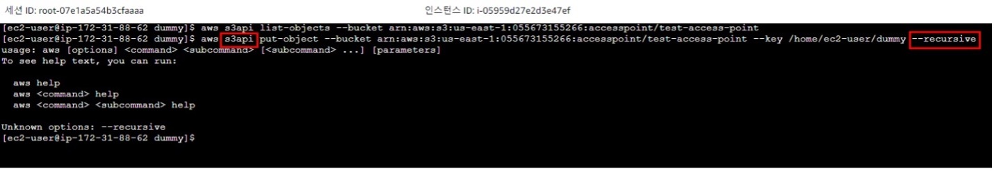 - 액세스 포인트에 접근하기 위해서는 s3api를 이용하여 액세스 포인트의 arn으로 접근요청을 해야합니다. (액세스 포인트를 통한 접근 외에는 전부 접근권한 없음으로 처리됨) 그렇기 때문에 cli s3 명령어(ex. aws s3 cp ~)가 아닌s3api 명령어(aws s3api put-object)를 사용해야하며, put-object의 경우 recursive 옵션이 없다는 것(혹은 다른 방법을 사용해야 한다는 것)을 알게 되었습니다. 이번 테스트는 참고문서를 토대로 진행되고 있었지만, 궁극적인 목표는 Public과 Private 간의 Put Request 비용비교이기 때문에 시간상 액세스 포인트를 이용한 접근방법은 보류하게 되었습니다.