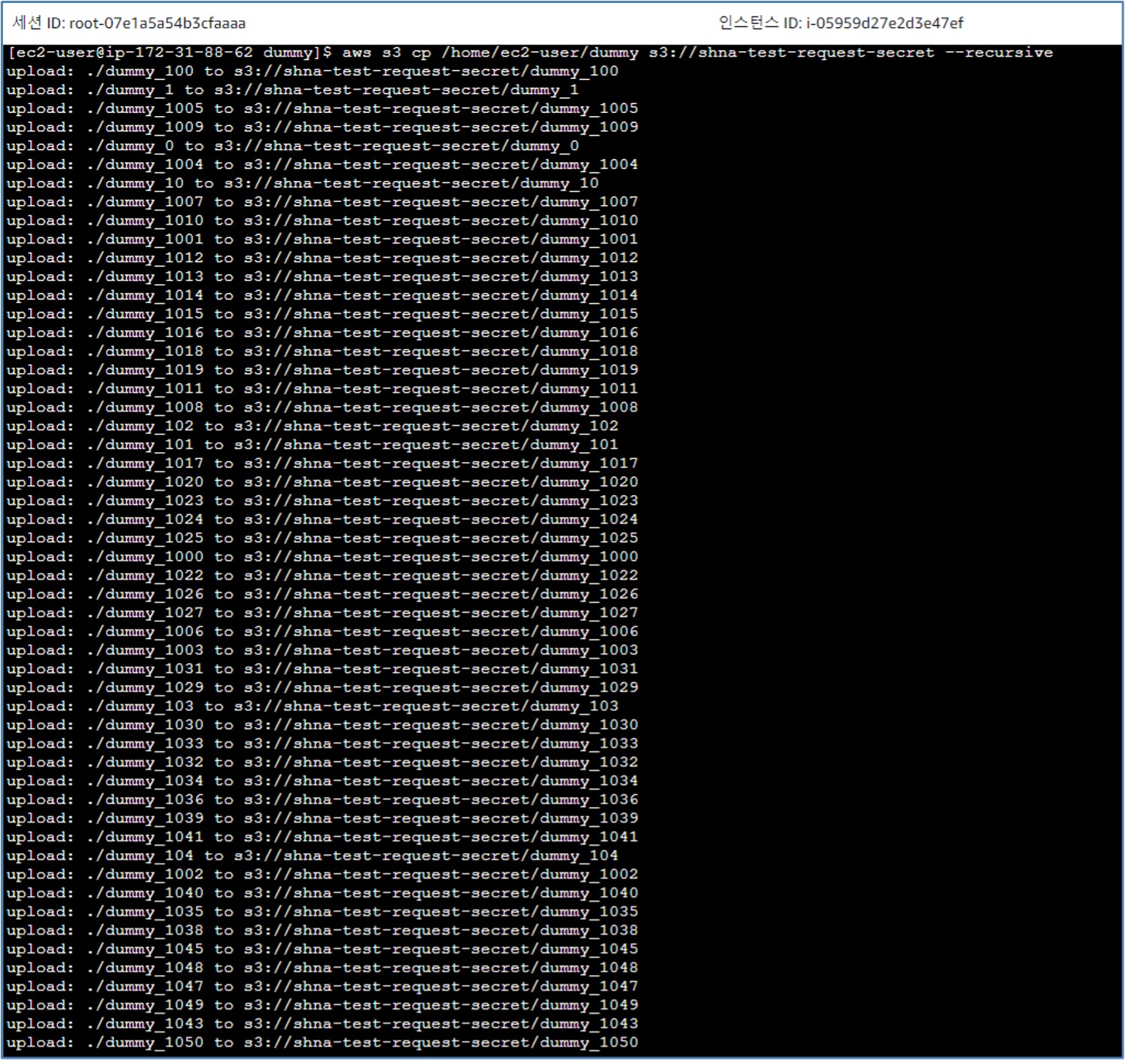 - 다시, aws s3 cp ~ 명령어를 통해 1만개의 객체를 Private EC2에서 S3 버킷으로 저장합니다. (1만번의 Put Request 발생)