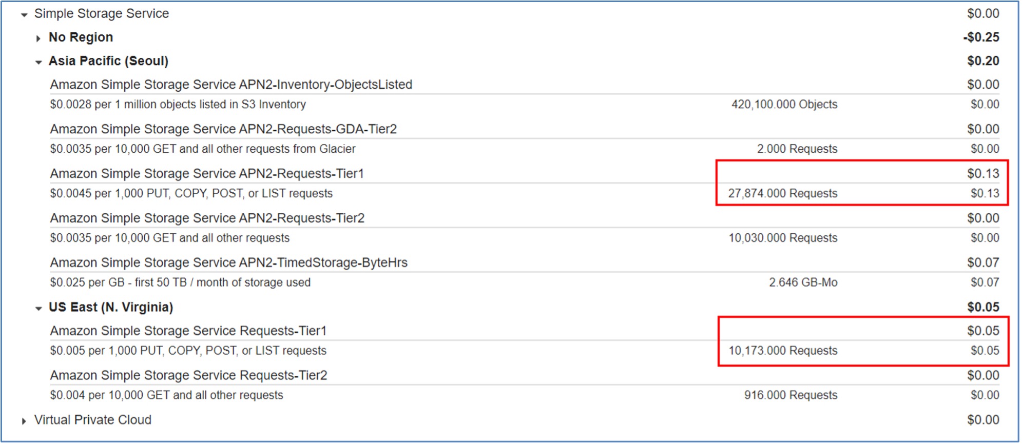 - 실시간 요금이 갱신되고 나서 (최소 몇시간 소요필요), 다시 한번 비용을 확인합니다. 확인 결과, 서울 리전(Public) 버지니아 리전(Private) 모두 1만건의 Put Request 발생한 것에 대해 $0.05가 청구된 것을 확인할 수 있습니다. (서울리전의 경우 테스트전에 이미 $0.08 요금이 부과된 상태이기 때문에 $0.13 - $0.08 = $0.05)